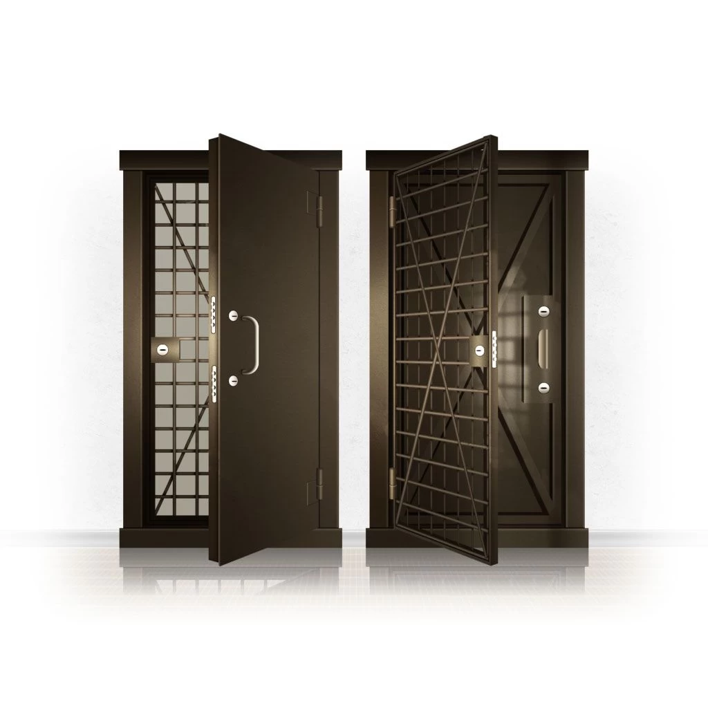 Металлические двери КХО и КХН представляют собой входные блоки, обладающие высоким уровнем взломостойкости и состоят из трех основных элементов: усиленного каркаса, сплошного металлического полотна и решетчатой двери. Дверной блок изготавливается из стального уголка 100*100 мм. Места крепления блока к стене цементируются и закрываются стальными наличниками шириной 40 мм. Крепеж заходит вглубь стены на 80 мм. В конструкции внешней створки монтируются ребра жесткости, для обшивки используется сталь толщиной не менее 3 мм. Внутренняя решетка изготавливается из прутка диаметром 16 мм. Размер ячеек решетки должен составлять не более 15 на 15 см. В точках пересечения прутья надежно приваривают друг к другу. В КХО и КХН необходимо поддерживать определенную температуру и влажность. Для этого внутреннее пространство глухой двери заполняется теплоизоляционным материалом, а по периметру двери приклеивается уплотнитель. Такие двери оборудуются замками с повышенным уровнем взломостойкости. Специализированные двери КХО и КХН в Назране могут быть оснащены сигнализацией, в конструкции могут быть проушины для навесного замка и элементами для опечатывания. Если идет речь о двери в комнату хранения оружия, в створке оборудуется окно для выдачи оружия и спец. средств, которое накрывается стальной дверцей.