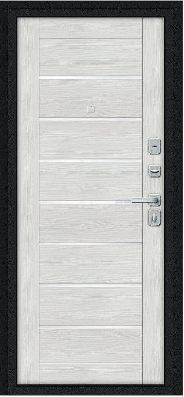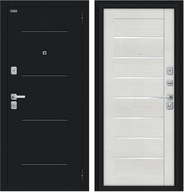 Надежная входная Дверь Браво Техно/BChrome Букле черное/Bianco Melinga премиум класса по цене 34 927 руб. Большая толщина стали защитит от проникновения в ваш дом, квартиру или коттедж. Используется очень качественная фурнитура: замки, цилиндры, ручки, защелки. Покрытие и отделка двери изготовлено под внимательным контролем производителя. Дверь имеет долгий срок службы и гарантию.